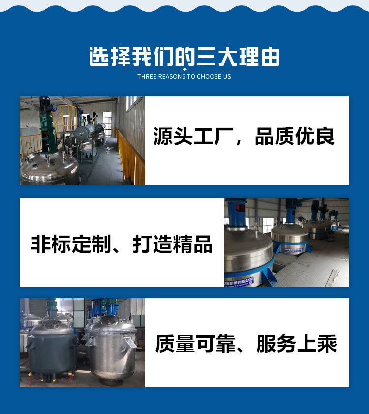 公司專業(yè)生產(chǎn)50-5000L系列不銹鋼反應(yīng)釜、電加熱反應(yīng)釜、汽加熱反應(yīng)釜、高壓反應(yīng)釜、盤管式反應(yīng)釜、不飽和聚酯樹脂反應(yīng)釜等設(shè)備。反應(yīng)釜結(jié)構(gòu)由鍋體、鍋蓋、攪拌器、夾套、支承及傳動(dòng)裝置、軸封裝置等組成,工藝先進(jìn)、結(jié)構(gòu)合理、經(jīng)久耐用,并具有耐高溫、耐腐蝕、使用方便等特點(diǎn),目前已廣泛應(yīng)用于石油、化工、橡膠、農(nóng)藥、染料、醫(yī)藥、食品、科研等行業(yè),用來完成硫化、硝化、氫化、烴化、聚合、縮合等工藝過程,以及有機(jī)染料和中間體等其他許多工藝過程的反應(yīng)設(shè)備。