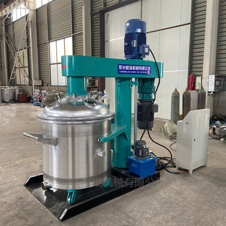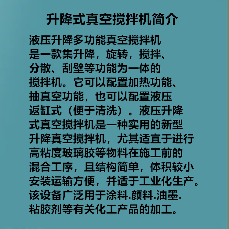 升降式真空攪拌機可以升降,旋轉,攪拌分散刮壁,抽真空,也可以配置電加熱。升降式真空攪拌機由電動機全速運轉帶動主軸,經主軸轉動攪拌框內之四氟攪拌片,使其將桶槽內之液體經框槽上、下兩側之導流葉片吸入環狀框槽內,經以主軸為中心高速旋轉葉片;連續使四氟攪拌片與筒體間小之間系高頻率之強力切割剪斷、粉碎,再借葉片高速離心旋轉,持續循環混合,以短之時間即可完成攪拌,分散,刮壁,刮邊之作用。升降式真空攪拌機配置兩個主電機,一個高速一個慢速。高速電機作用攪拌分散作用,慢速電機刮壁,刮邊作用。本攪拌機刮壁式攪拌裝置,增進產品的生產速度,一邊攪拌一邊刮壁,攪拌物料無死角。升降式真空攪拌機 適用于化工,醫藥及食品,調理食品(醬料類)、制藥(膏霜類)、日化(膏霜類)、膠粘劑,涂料等黏度(或)濃度較高的物料的預煮、配(炒)制,攪拌,濃縮。并可按工藝需要配備真空系統。