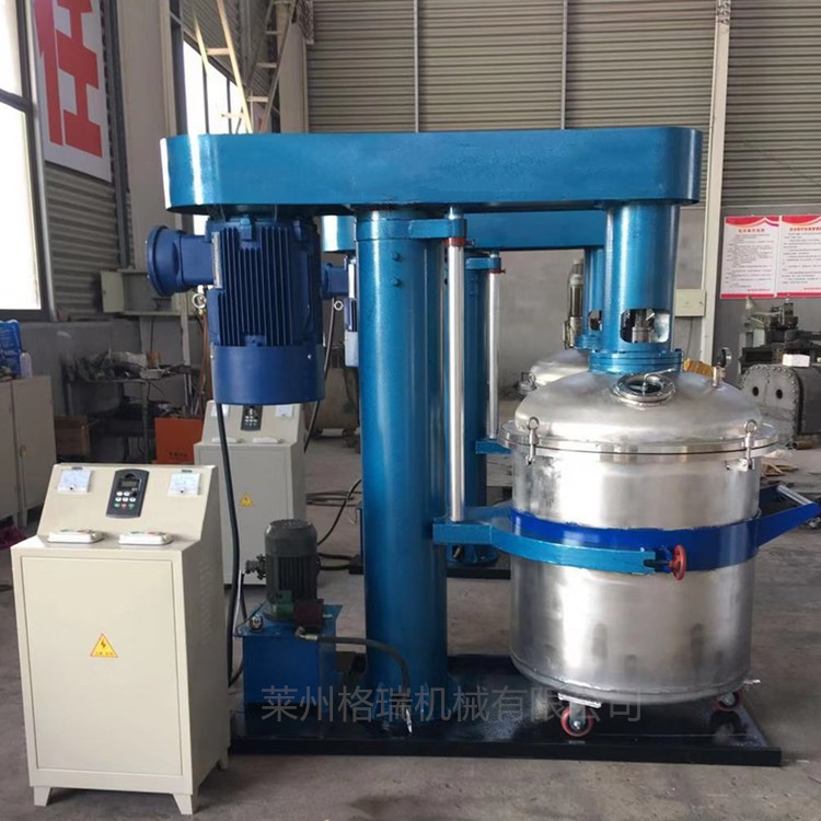 真空分散機是可以升降的真空攪拌機,能抽真空。升降式真空攪拌機可以升降,旋轉,攪拌分散。真空攪拌機系籍由電動機全速運轉帶動主軸,經主軸轉動乳化框槽內之乳化翼片,使其將桶槽內之液體經框槽上、下兩側之導流葉片吸入環狀框槽內,經以主軸為中心高速旋轉葉片;連續使乳化翼端刀面與乳化框之間系高頻率之強力切割剪斷、粉碎,再借葉片高速離心旋轉,持續循環混合,以短之時間即可完成均質乳化之處。